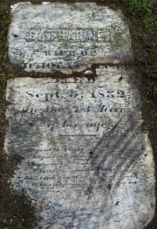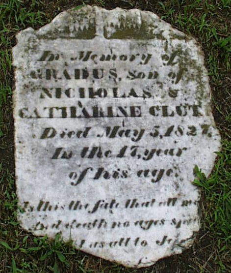 The gravestone of Alida , wife of Gradus Clute. Others buried there:Becker, Margaret , daughter of John & Eliza, d. 1826, 1yr. Clute, Nicholas, b. Oct. 15, 1778, d. Dec. 14, 1858 Clute, Caroline, wife of Albert, b. May 9, 1820, d. July 17, 1840 Clute, Caroline, daughter of Albert & Mary, d. Oct. 17, 1844, 1yr, 10mo., 8days Clute, Catharine, wife of Nicholas, d. Sept. 5, 1852, 73 yrs. Clute, Gradus, son of Nicholas & Catharine, d. May 5, 1827, 17 yrs. The full list of interrees can be found at Rootsweb. |